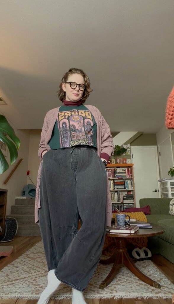 A graphic band tee layered under a dusty pink longline cardigan over dark wide leg trousers with white socks.