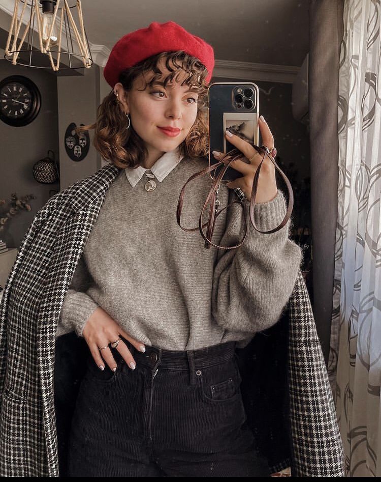A white collared shirt under a grey oversized knit sweater, dark corduroy wide legs, and a red beret tipped just right.