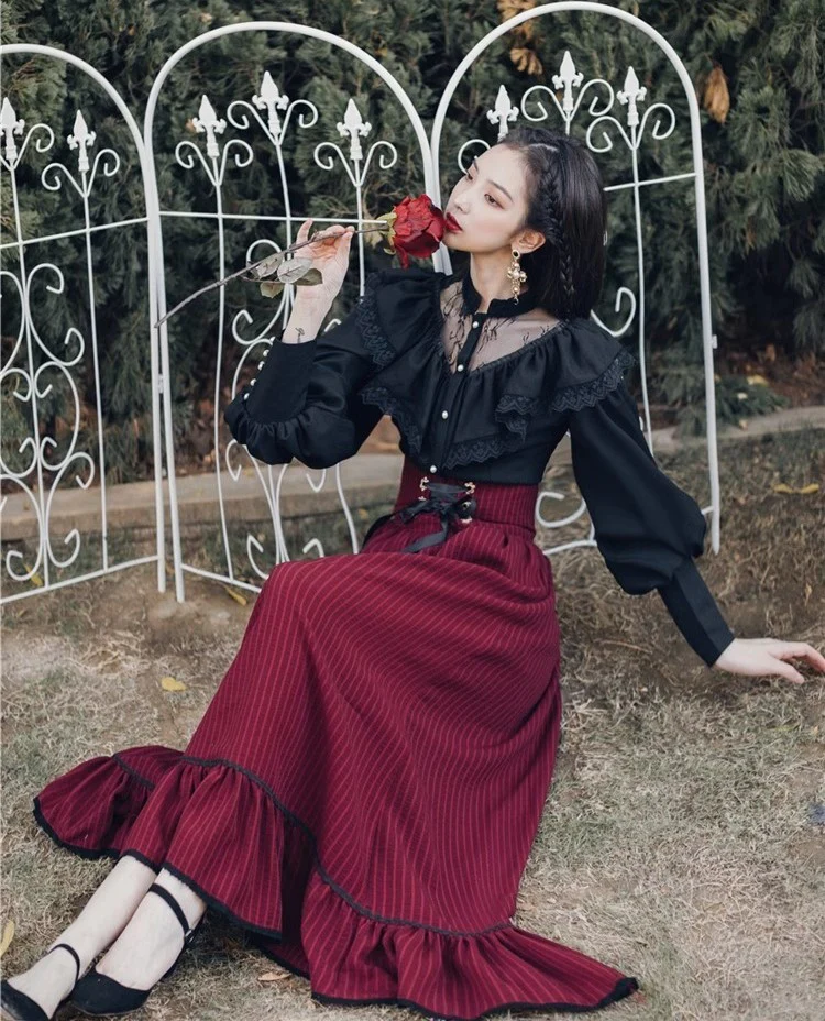 Black lace trimmed ruffle blouse, a deep burgundy striped midi skirt with a corseted waist and ruffle hem, black Mary Janes.