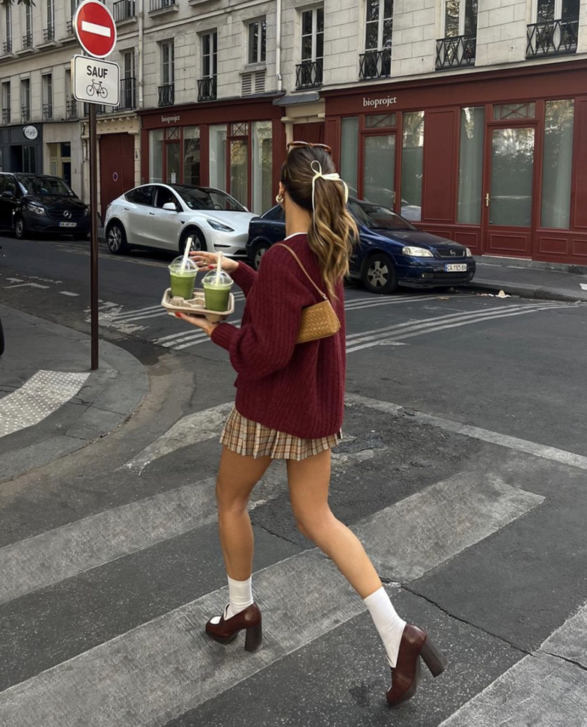 An oversized burgundy knit over a plaid pleated mini, white ankle socks with platform Mary Janes in chocolate brown, and a woven mini bag.