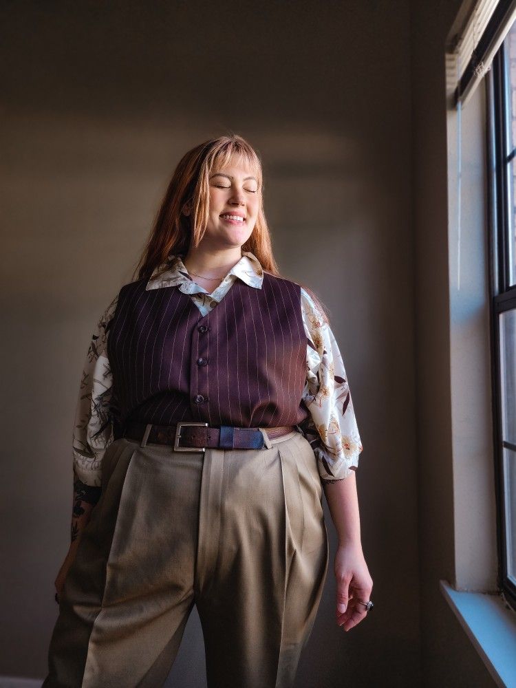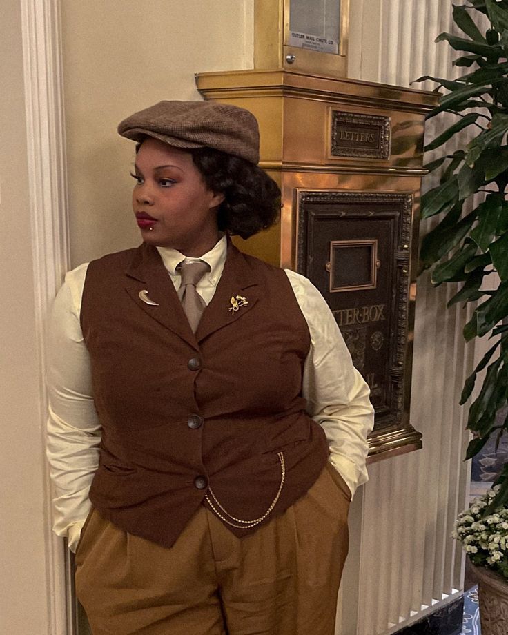 A white collared shirt, a brown tailored vest with actual pocket chain details, gold pins, a silk tie, and a tweed flat cap is basically a character from a novel come to life.