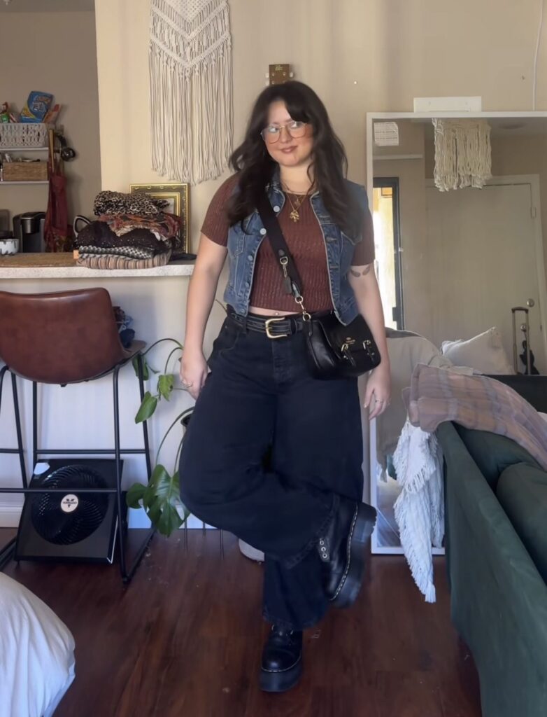 Black wide leg jeans, a rust brown crop tee, a denim vest, chunky belt, and platform boots.