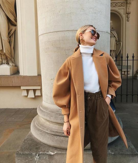 White turtleneck. Olive wide leg trousers. An enormous camel wool coat with dramatic sculpted sleeves worn open.