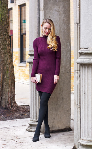 Or, flip the script by styling a deep purple ribbed sweater dress with matching deep purple tights.
