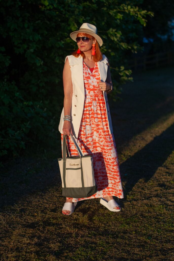 Layering a long white vest over a bold printed maxi is such a clever move for summer evenings when you need that extra piece but do not want anything heavy.