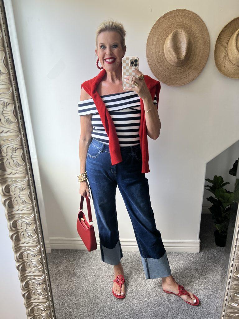 Striped off shoulder top, wide leg cuffed jeans, and then BAM, red sandals, red bag, red cardigan draped over the shoulders.