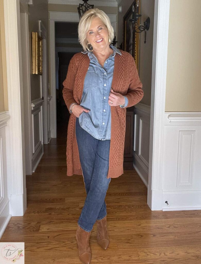 Chambray shirt layered under a long rust cable knit cardigan with slim jeans and tan ankle boots.