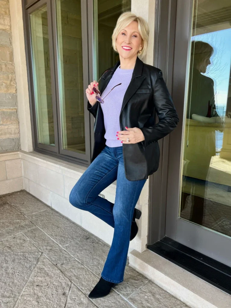 Lavender ribbed knit top, flare jeans, black ankle boots and a black leather blazer.