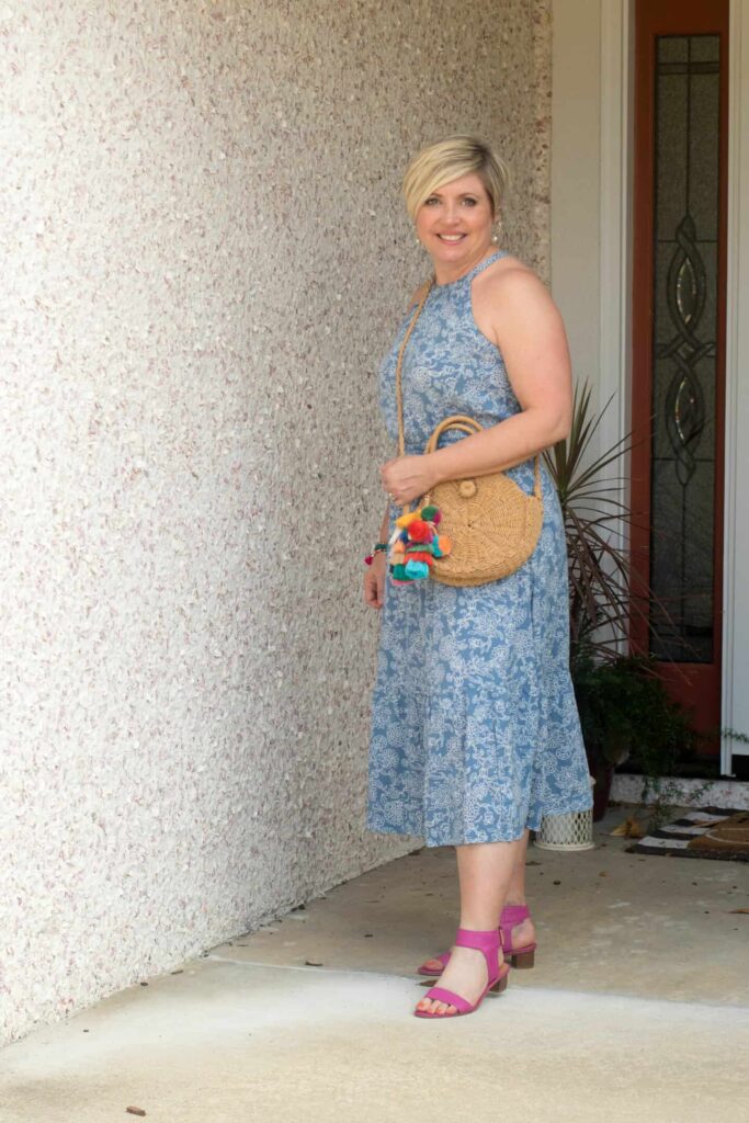 Pale blue floral midi dress with those hot pink block heel sandals is such an unexpected and brilliant combination.