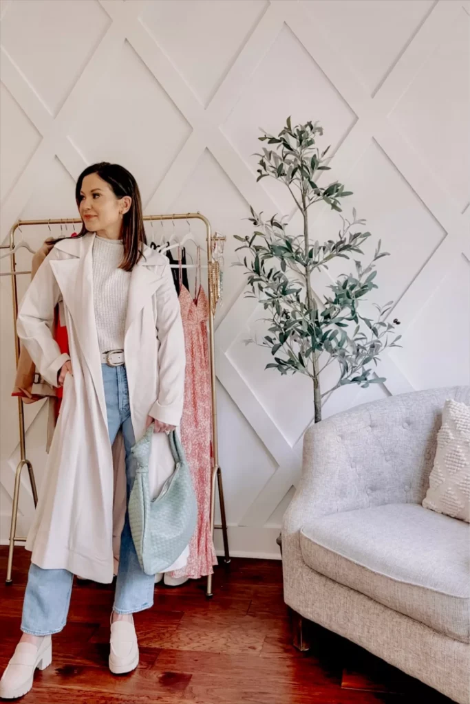 Cream duster coat over a neutral knit, wide leg jeans, white platform loafers and a woven tote.