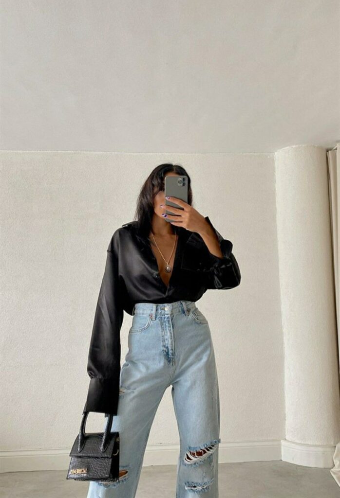 Deep V black satin tucked loosely into light ripped jeans with a micro croc bag dangling at the hand is giving quiet confidence in a way that feels completely natural.