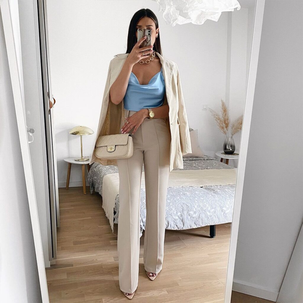 The powder blue cowl neck satin cami peeking out beneath a slouchy cream blazer over wide leg trousers is the definition of dressed up without dressing loud.