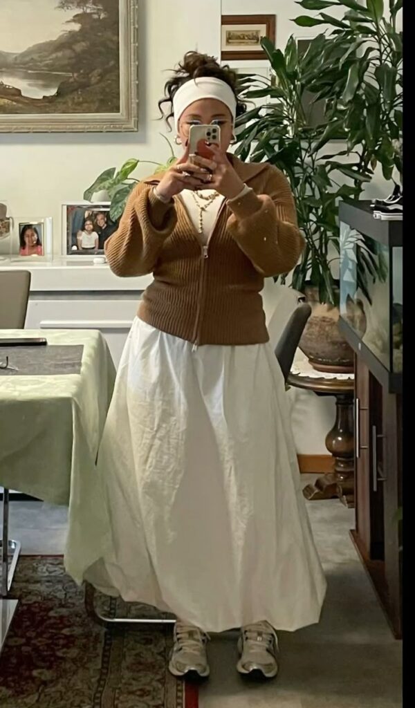A zip up caramel ribbed knit layered over a flowy white maxi skirt with chunky dad sneakers and a white headband is for the girl who keeps it cool and still looks completely deliberate.