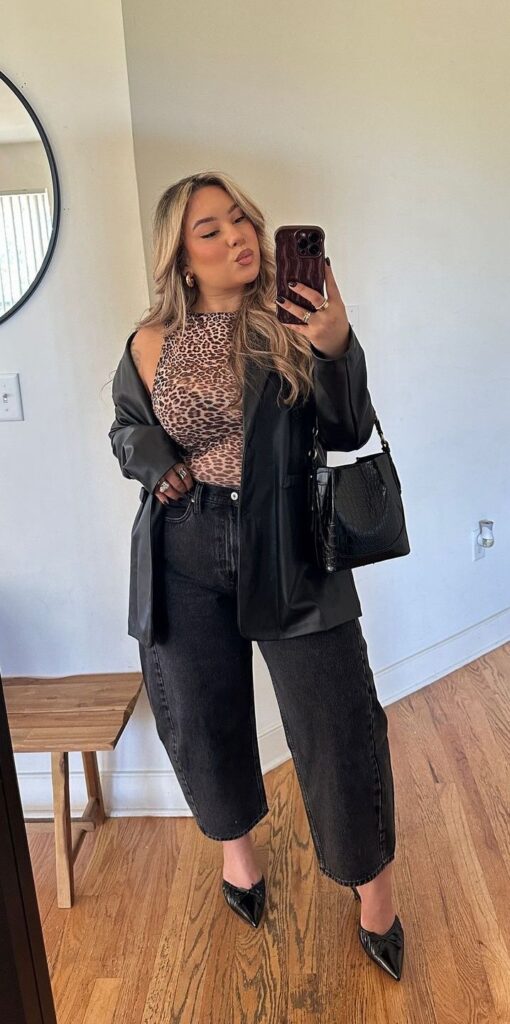 Using a leopard print bodysuit as the base layer beneath an oversized black leather blazer is such a smart going out move.
