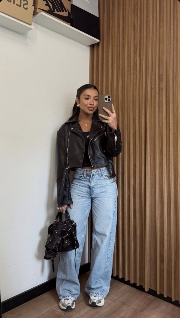 There is genuinely no going out formula more reliable than a cropped leather biker jacket over a black top with wide light wash jeans and chunky sneakers. It works every time without exception.