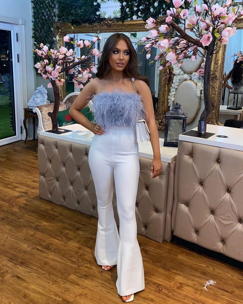 Pairing a dramatic feather bustier with sharp white flare trousers is one of those combinations that sounds chaotic but lands perfectly.