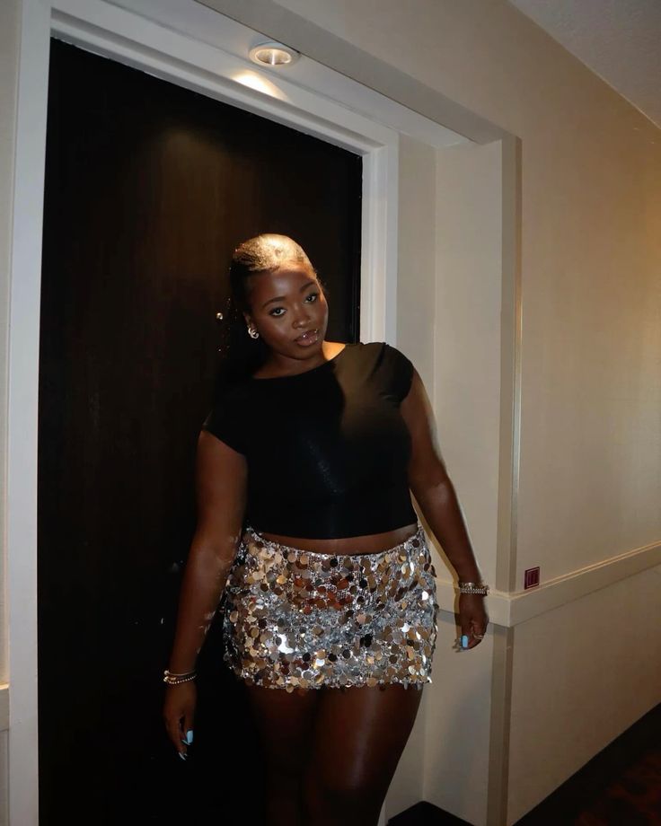 Some outfits just work and this is one of them. A fitted black crop against a silver mirror disc micro skirt creates that classic going out contrast that photographs beautifully under any lighting.