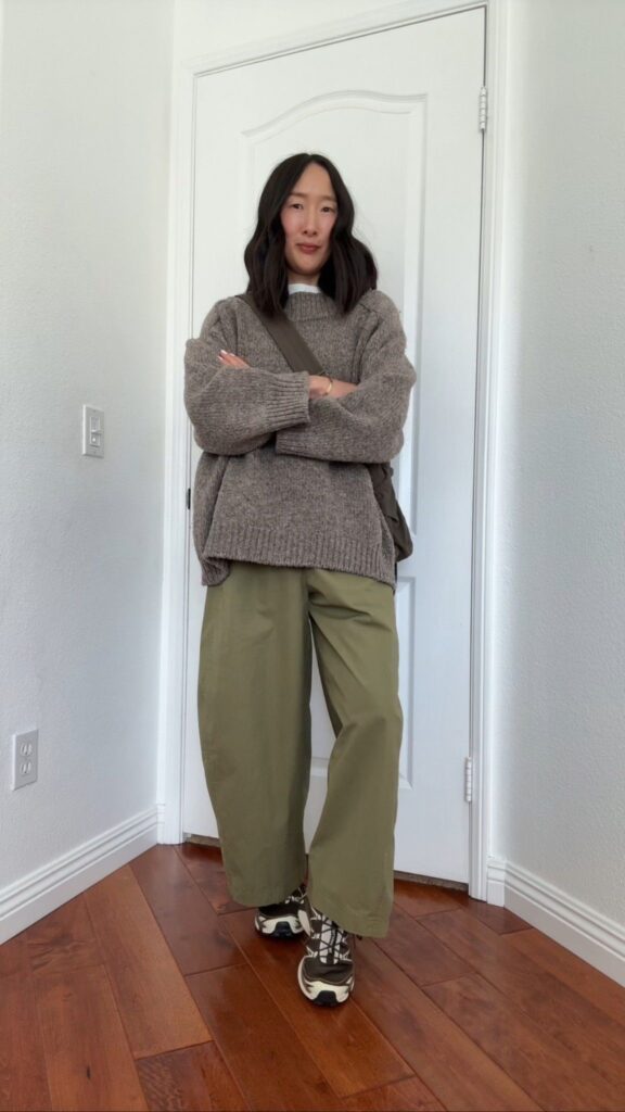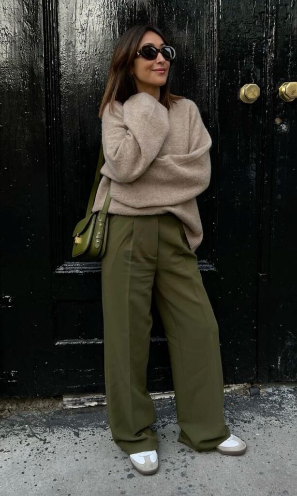 Honestly, this is the outfit that makes people stop and ask what you’re wearing. Olive wide leg trousers paired with a camel oversized knit is basically a masterclass in tonal dressing. The green leather crossbody ties everything together so naturally it feels intentional without being try hard. Retro shades and trainers keep it grounded. You ought to try matching your bag to your trousers like this — it quietly elevates everything.