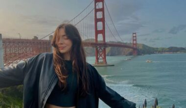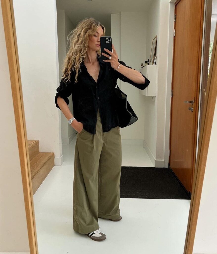 Black shirt, wide olive trousers, curly hair, a big bag — this is the look of someone who has genuinely figured out personal style. Leaving the shirt slightly open and rolled at the sleeves gives it that effortlessly undone quality that usually takes ages to perfect. The sporty sandals at the hem add a casual, lived in finish. A silver watch is literally all the jewellery this needs. So good.