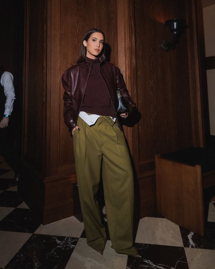 Burgundy and olive is genuinely one of the most underrated colour pairings, you know. A rich oxblood leather bomber over a matching knit with a shirt collar peeking out below gives so much layering texture. Wide leg olive trousers in a lighter, more yellow toned green make the whole look feel luxe and directional. This is the outfit for gallery openings, dinners, anywhere you want to look like you have actual taste.