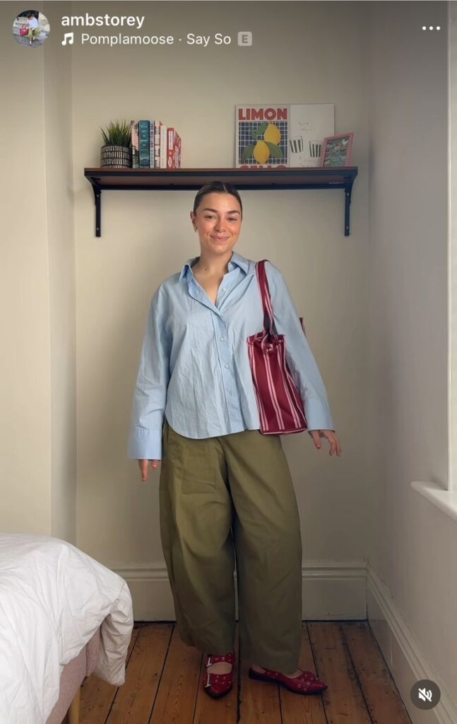 Sky blue and olive green sounds like a weird choice until you see it in action and suddenly you cannot imagine them apart. The boxy oversized shirt untucked over wide barrel trousers gives such a relaxed, intentional shape. Those cherry red flats and the matching tote? Chef’s kiss. This combo works because blue and green share cool undertones — so remember that trick next time.