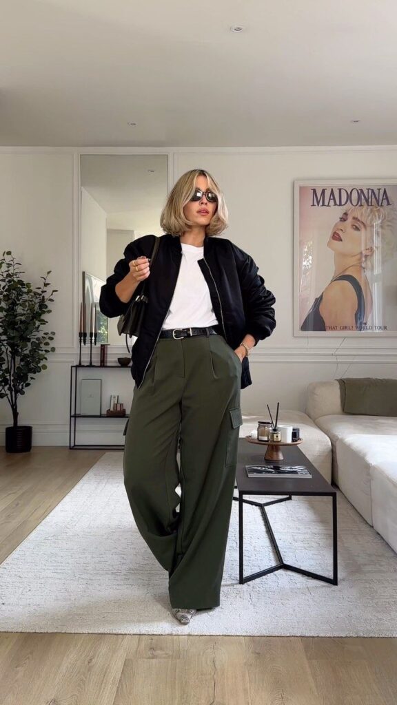 This outfit has main character energy and the Madonna poster behind her is honestly very fitting. Black satin bomber, crisp white tee, belt anchoring the waist, dark olive wide leg cargos and barely there snake print heels at the hem — the contrast is everything. The heels under cargo trousers is such a good trick for making the whole look feel elevated instead of too casual. Sunglasses on, attitude activated.