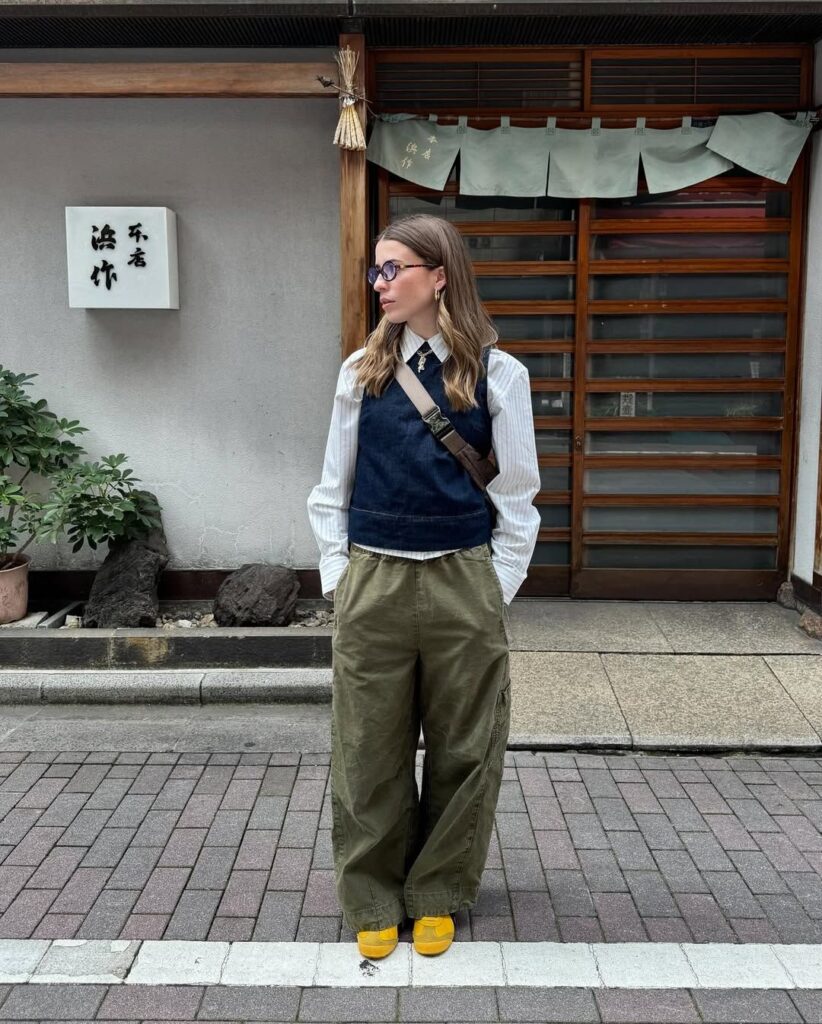 Okay so this is for the experimenters. A striped button down layered under a denim vest, olive barrel leg trousers and yellow clogs in Japan — it sounds chaotic but it is so well executed. The vest acts like a waistcoat and structures the whole top half. A crossbody bag worn across the chest adds to the layered feel. Those yellow shoes are genuinely bold but they make the whole outfit memorable. Very much a vibe.