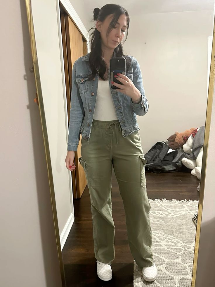 Denim jacket over a white tank with olive cargo pants. I mean, you have probably owned all three of these pieces for years, right? The magic is in wearing the jacket fitted against the roomier trousers to create contrast in silhouette. Tuck the tank in just slightly at the front. White sneakers finish it cleanly. So simple but it just works every single time.