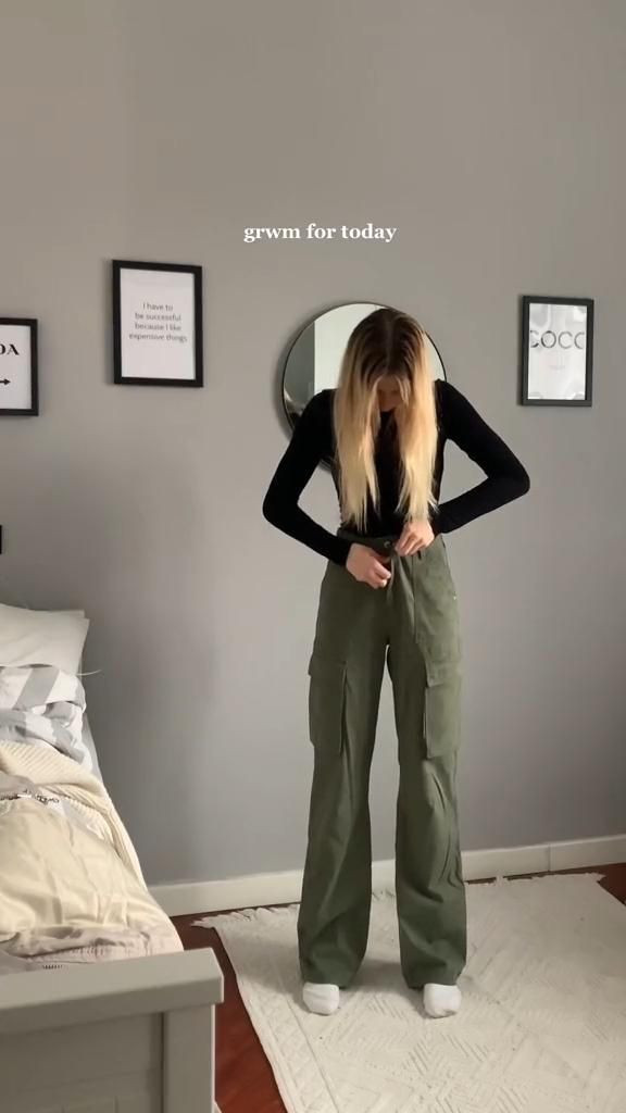Sometimes you just want your green pants to speak and your top half to stay quiet. A fitted black long sleeve tucked into olive cargo trousers is basically the most effortless version of this. No accessories needed, no overthinking. This look works because the dark top makes the green pop without any extra effort. White trainers ground it so it does not go too dark and heavy overall.