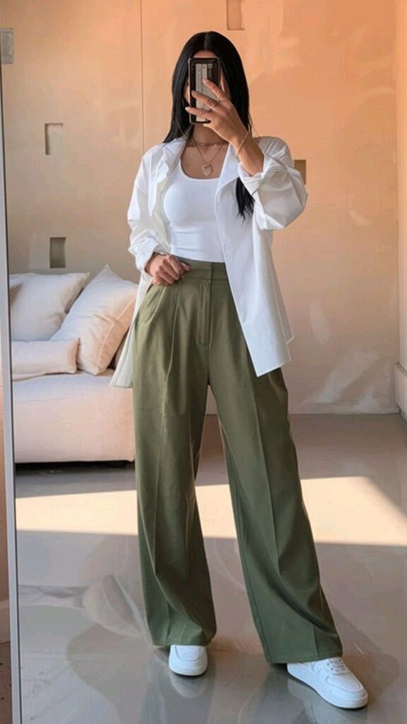 White on white on olive. Honestly this is the outfit that looks like it required zero thought but is actually quite precise. An open white button shirt layered over a fitted white tank with high waisted wide leg trousers is clean, modern and endlessly wearable. Tuck the tank but leave the shirt loose. White sneakers, a delicate necklace, and you are genuinely done. So easy it is almost annoying.