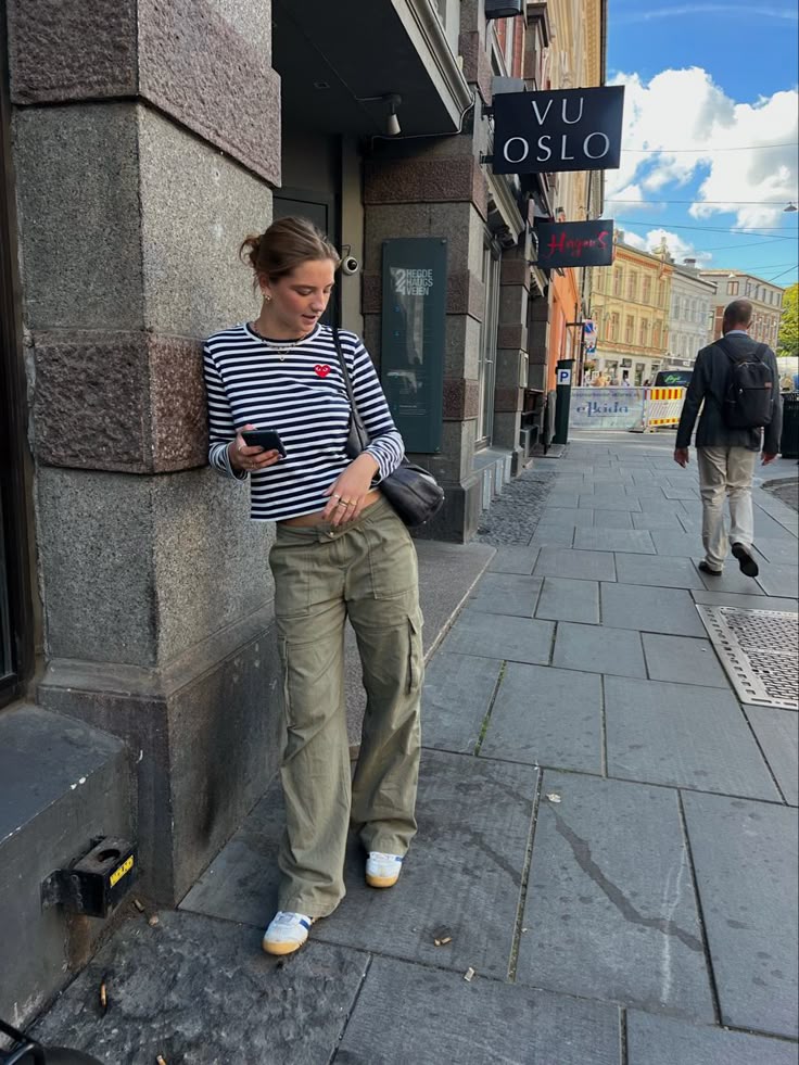 For the girlies who want their green pants to look like an actual street style shot — this is it. The striped long sleeve with the little embroidered heart brings so much personality without competing with the cargo trousers below. Slim on top, wide on the bottom is literally the golden ratio of dressing. Layer a small black crossbody low on the hip and you are done.