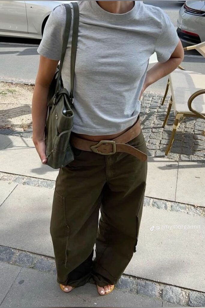 This is giving Parisian street style and we are so here for it. Low rise dark olive cargos with a chunky leather belt sitting just below the waist, a fitted grey tee tucked barely, and strappy sandals — it sounds simple but the styling is everything. The oversized olive tote pulled from the trouser colour is a great trick. Wear this to a farmers market or a café and someone will literally photograph you.