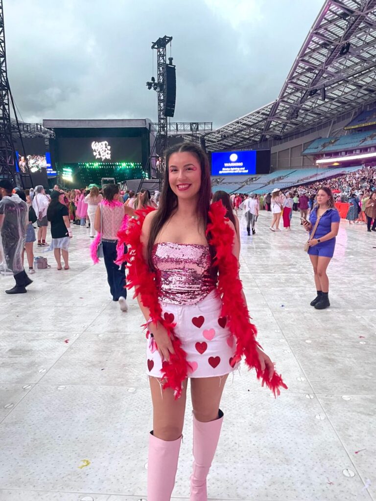 So this is such an enthusiastic and joyful concert outfit and you can literally feel the energy. The heart graphic crop top with high waisted pink jeans and a pink feather boa worn as sleeves rather than a scarf is such a fun choice. It gives the look movement and drama without adding much weight. The tinted sunglasses on the head finish it perfectly.