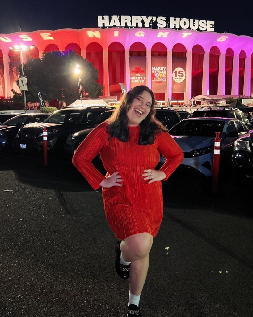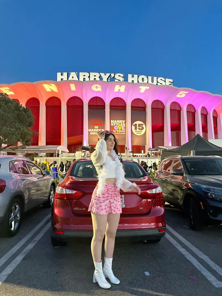 Sometimes the boldest choice is also the right one. Head to toe red velvet mini dress at Harry’s House is such a committed and confident move. It photographs beautifully under concert lighting and honestly it practically matches the building. Black patent loafers with white socks add a really fun quirky touch that feels very Harry coded.