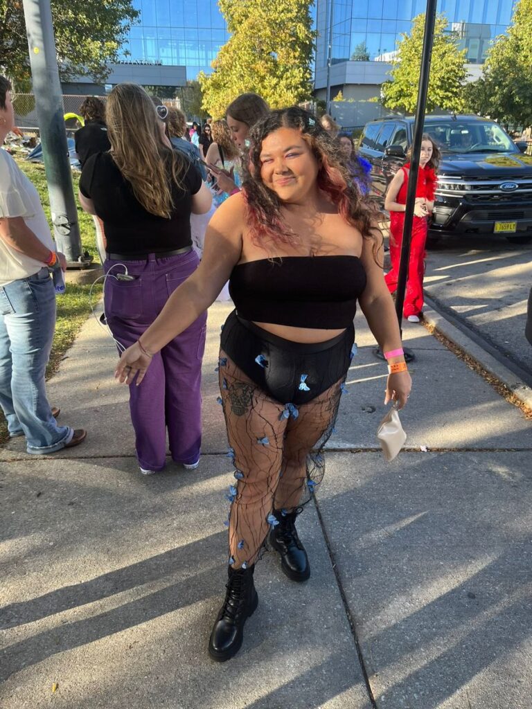 Okayyy this one is genuinely creative. Black strapless crop top with an all over sheer net skirt featuring applied blue butterfly details and combat boots underneath. It is edgy, artistic and so individual. You are not going to bump into anyone else in this outfit and that is basically the goal. The blue butterflies are such a clever nod to the whole Love on Tour aesthetic.