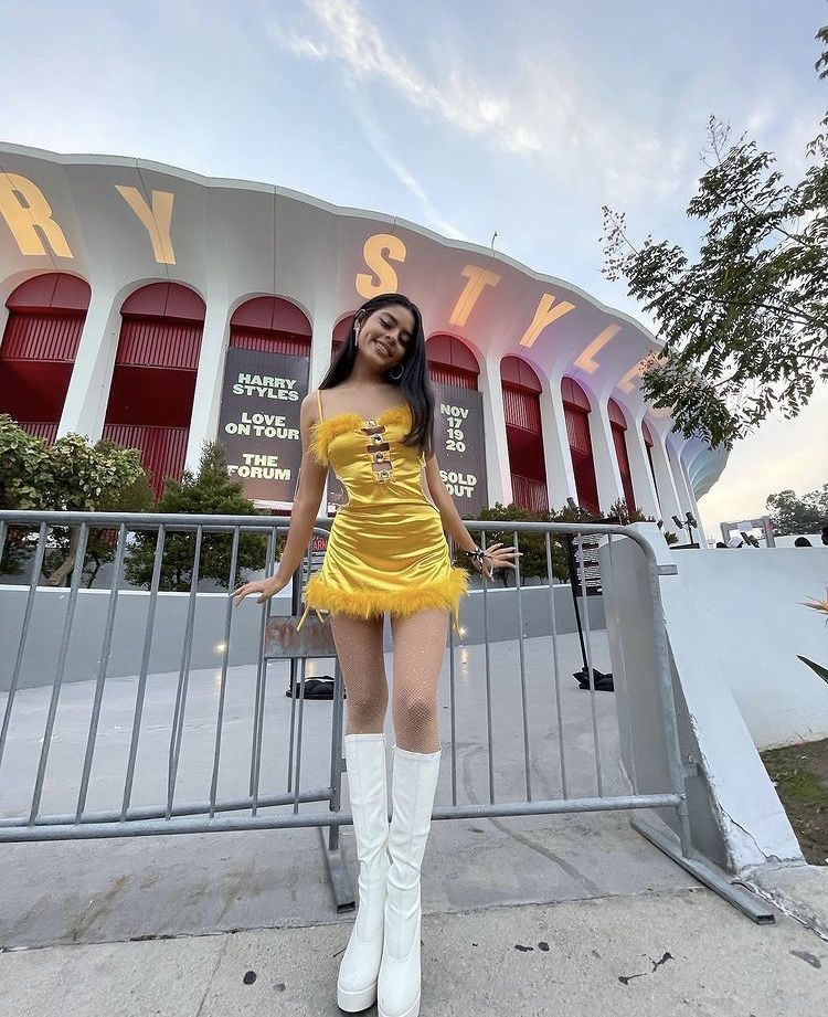 This outfit came to be seen and it fully succeeded. The yellow satin feather trim mini with gold hardware details is so bold and so right for a Harry crowd. Fishnet tights add texture and the chunky white platform boots ground the whole thing perfectly. I mean, this is the outfit you plan for weeks and absolutely do not regret for a single second.
