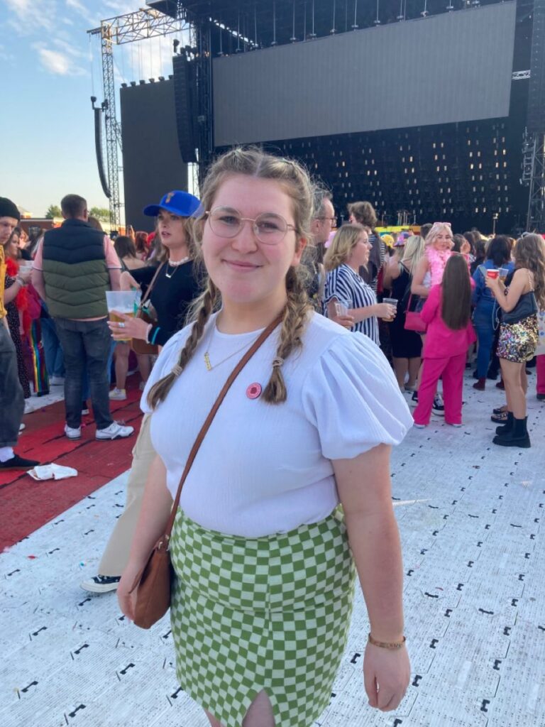 Not everything needs to be a production and this look proves it perfectly. White puff sleeve top with a green checkerboard mini skirt, a tan crossbody and a delicate name necklace. It is cute, considered and completely comfortable. The checkerboard print gives it enough personality to feel like a real concert outfit without going overboard. So good for the fan who wants to look effortless.