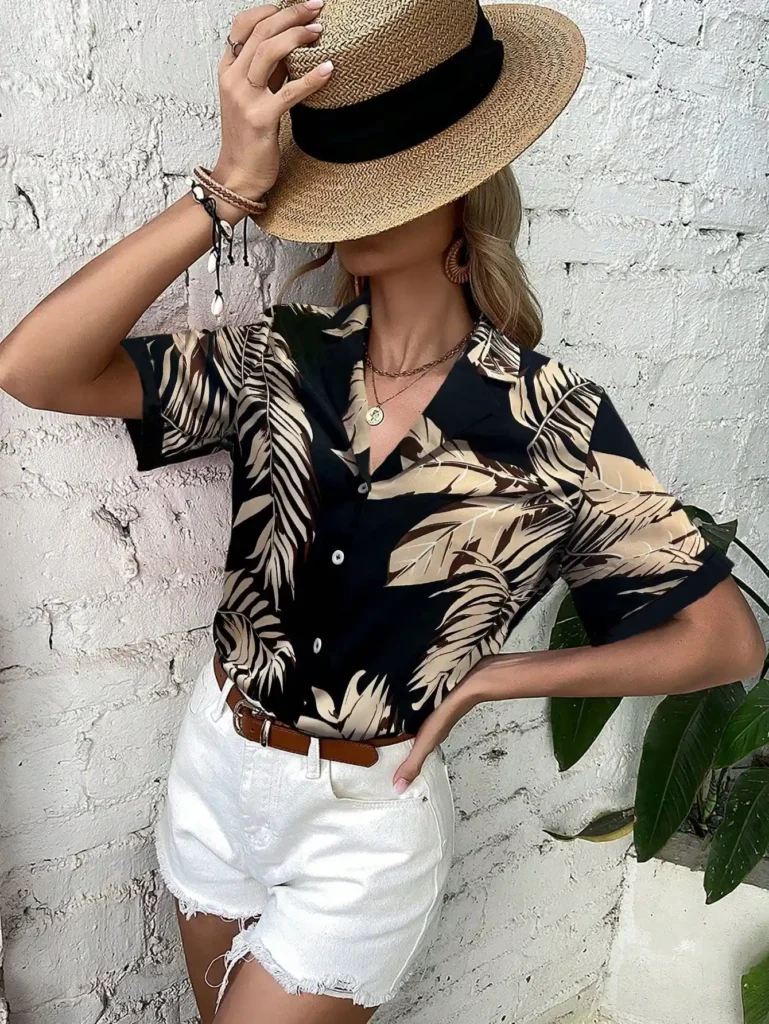 That oversized tropical shirt paired with denim shorts outfit ideas and a neutral tank creates such an effortless island vibe.