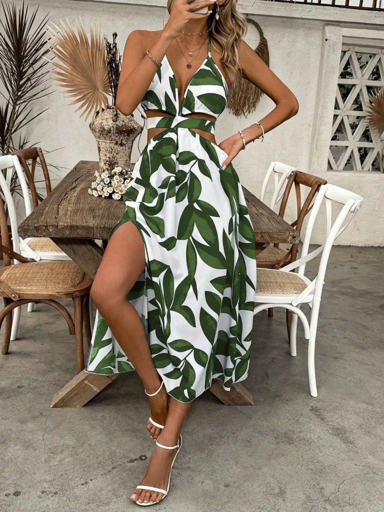 The plunging neckline and cutout waist give it serious evening energy while those flowing maxi dresses outfits ideas vibes keep you comfortable in humidity.
