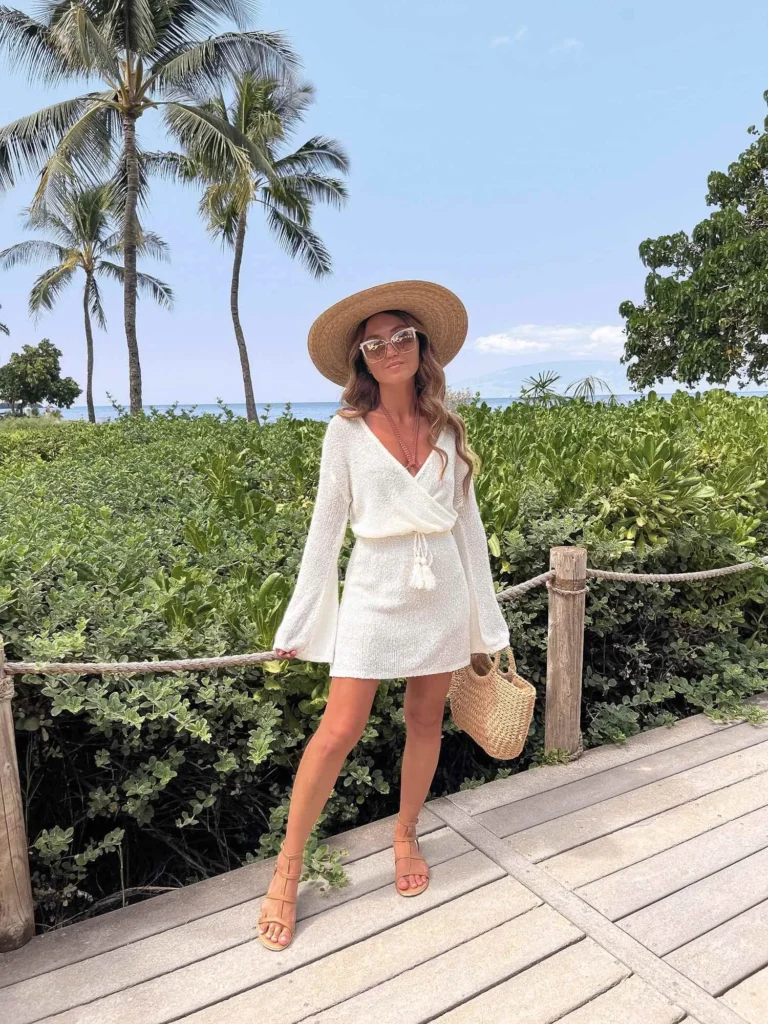 A white linen wrap dress with that plunging neckline and tie waist creates such an elegant silhouette for island exploring.