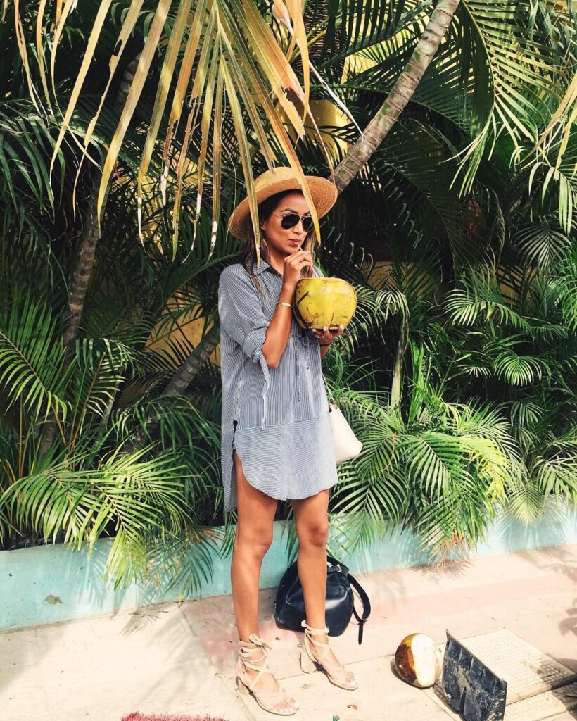 A coconut drink and woven bag complete the whole tropical fantasy without overdoing it. This outfit works beautifully for those lazy beach days when you’re alternating between the water and your towel.