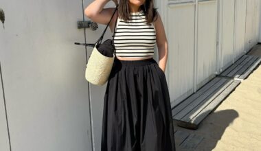 White bandeau crop top, green floral sarong skirt tied at the hip, gold coin necklace, white mule heels and a sunshine coloured mini bag. Simple, elegant, completely resort appropriate. The sarong skirt is such a smart choice because it looks intentional but is honestly so easy to wear. This is your beachside restaurant outfit sorted with minimal effort and maximum impact.