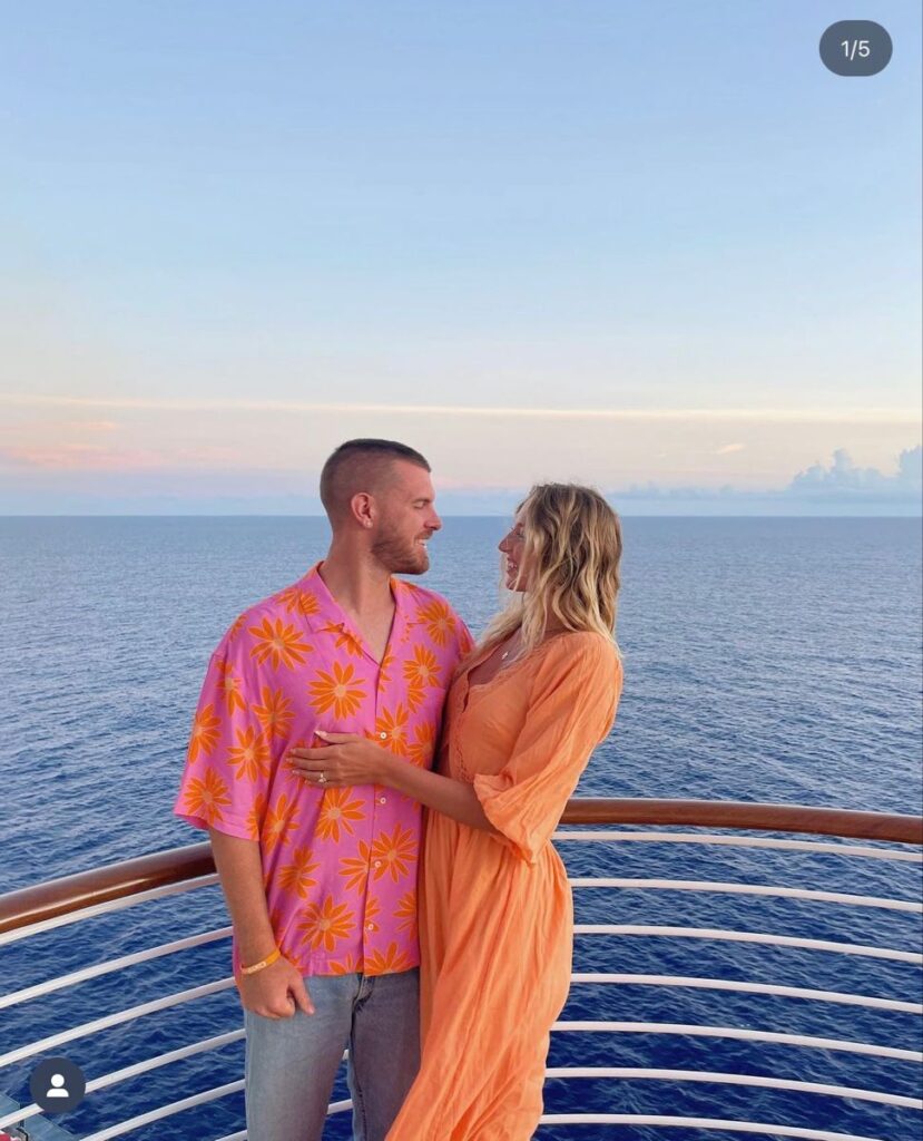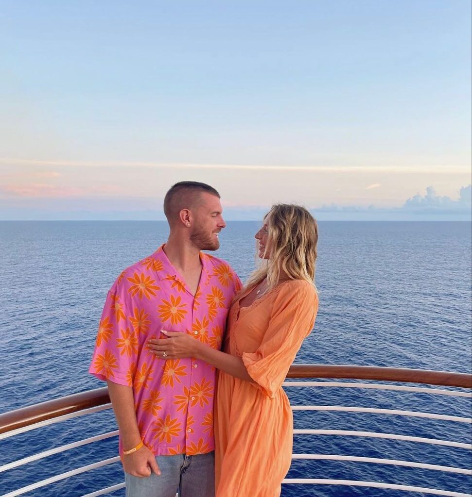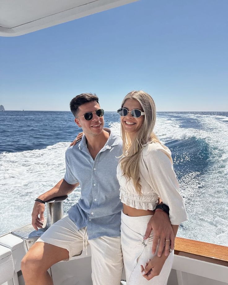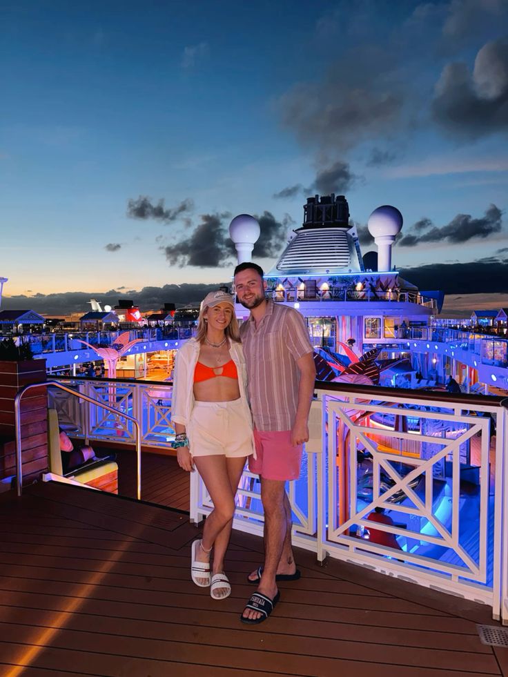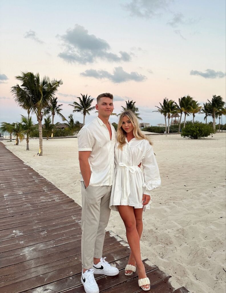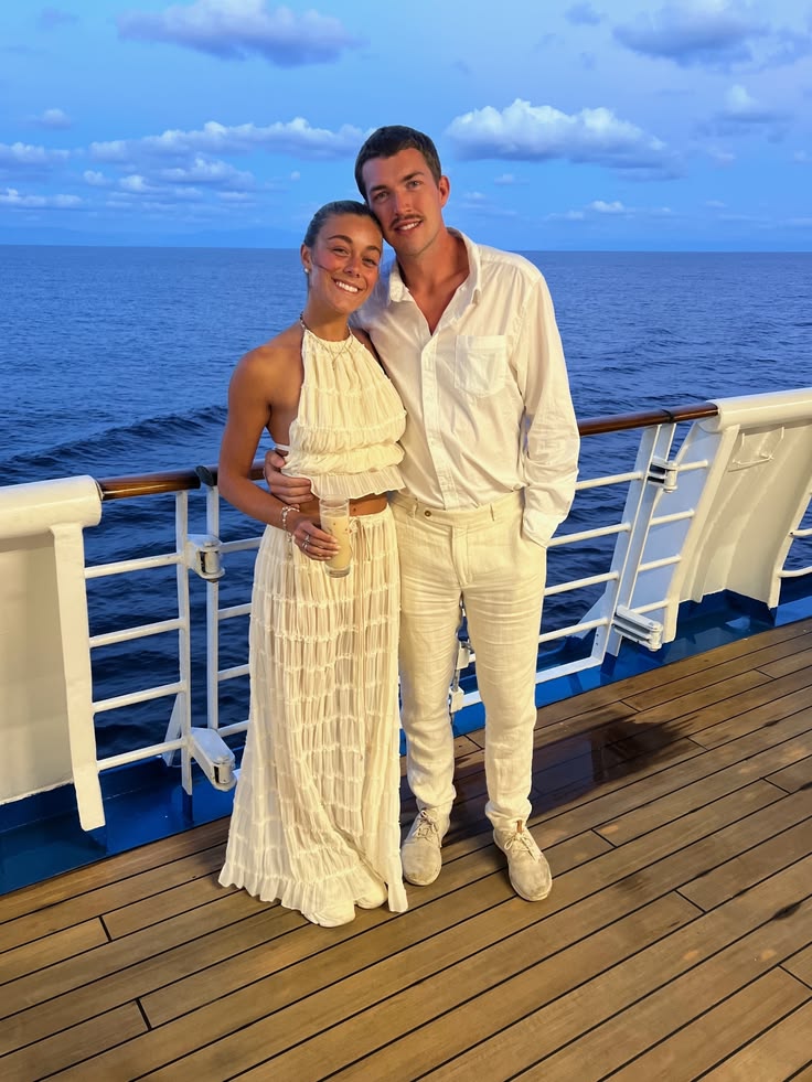 All cream everything on a cruise deck at golden hour. I mean come on. Her textured halter co ord set with the flowing wide leg trousers and his crisp white linen shirt with slim trousers is so elegant without being overdressed. The trick with full white outfits is keeping the fabrics interesting so everything doesn’t blur together, and they completely nailed it.