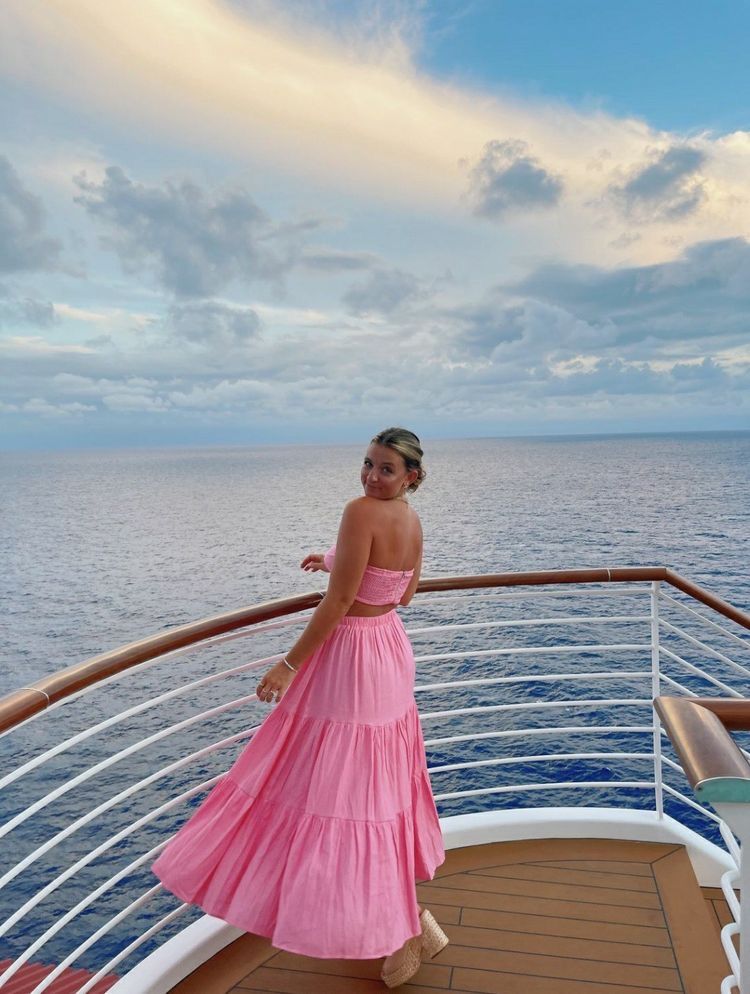 That bubblegum pink strapless bandeau crop top and tiered maxi skirt is such a good cruise sunset outfit because the skirt catches the wind and photographs beautifully from every angle. She clearly knows this based on the way she is looking back at the camera. Wedge espadrilles add just the right height. You ought to own at least one matching co ord set for any beach holiday.