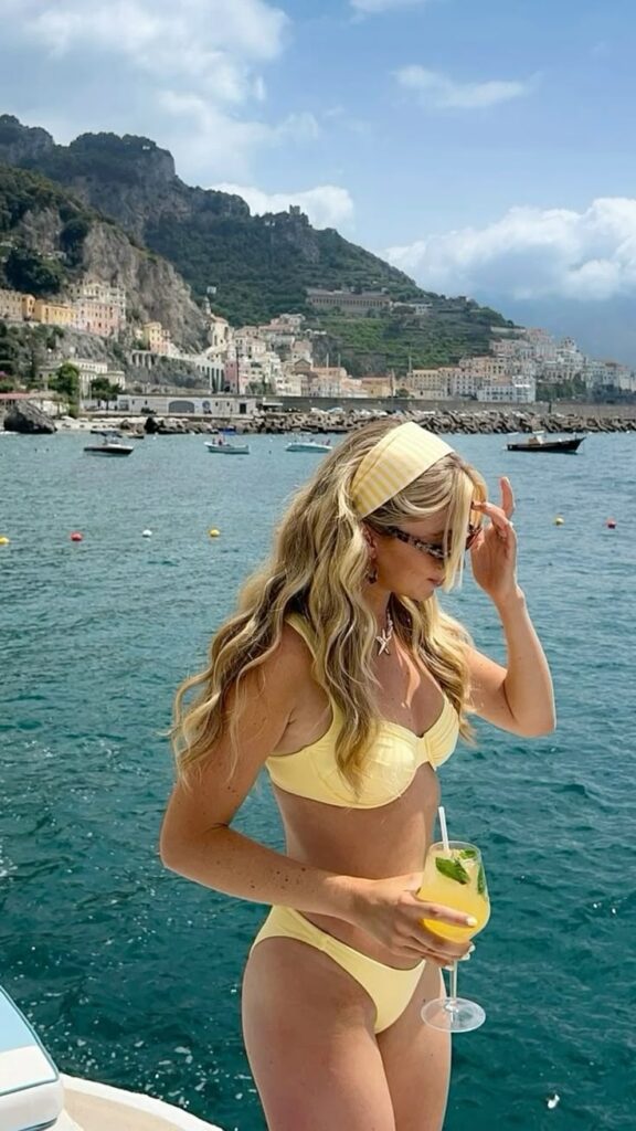 Yellow and the Amalfi Coast were literally made for each other. The ribbed yellow bikini with a matching striped headband is giving pure Italian summer and it completely works against that backdrop. Layer a matching cover up for walking to the boat or leave it off entirely. The stacked necklaces and oversized shades do all the accessory work so you don’t have to overthink anything else.