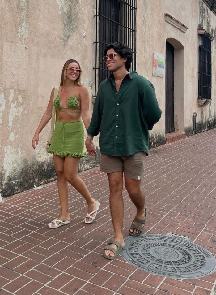 Who coordinates in green tones on a cobblestone street and looks this good? Her green floral crochet bikini top and matching ruffle skirt is so fun and summery. His dark green linen shirt with taupe shorts picks up the colour without being too on the nose about it. Matching sandals seal the deal. This is the kind of couple photo that gets saved by thousands of people.