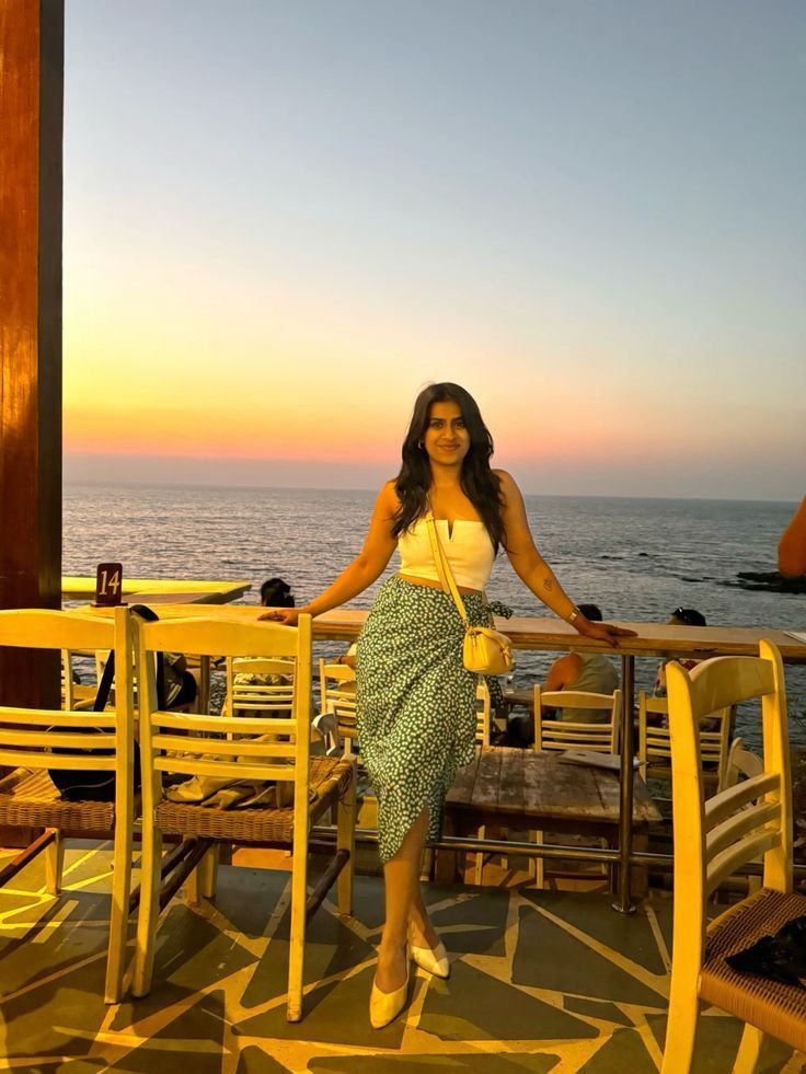 Okay the strawberry and cherry strapless mini dress is so fun and summery it deserves its own appreciation post. She kept jewellery minimal with just gold hoops and a delicate necklace which was exactly the right call. Next to the orange crochet deep V maxi dress they honestly look incredible together. If you’re cruising with your best friend, this is the sunset dinner look to coordinate around.