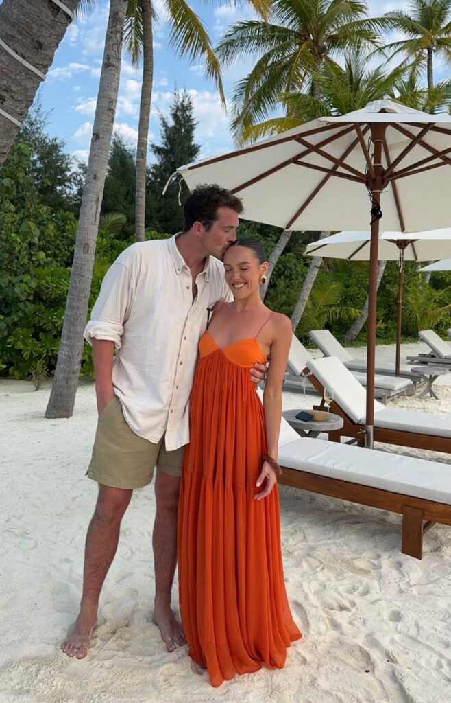 Bold colour coordination done so well. The oversized pink daisy print shirt over denim jeans with her flowing orange maxi dress is such a warm, joyful pairing. These two shades honestly shouldn’t work as well as they do and yet here we are. If you want couple photos that pop against a blue ocean backdrop, warm tones like this are literally always the move.