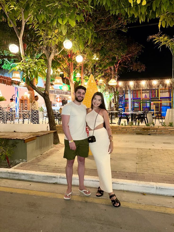The cream crochet halter top and matching midi skirt set against string lights and a tropical backdrop is genuinely one of the best vacation evening outfit choices. She kept accessories minimal with just a small crossbody and it works so well. He went simple with a white tee and khaki shorts which honestly lets her outfit shine exactly the way it should.