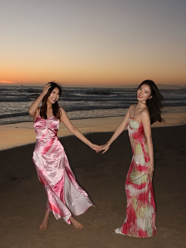 Two floor length satin dresses in coordinating pink tones at a beach sunset is so dreamy it almost feels unrealistic. The ruched pink halter silhouette and the multicolour pleated strapless both catch the golden hour light so beautifully. If you and your best friend are heading somewhere tropical, this is genuinely the photo that makes everyone’s jaw drop. Go find your satin dress immediately.